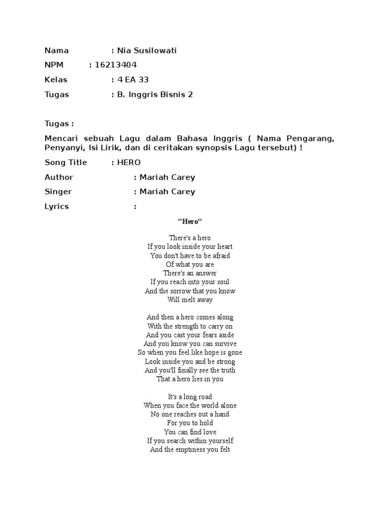 There's a hero if you look inside your heart you don't have to be afraid of what you are there's an answer if you reach into your sould and the sorrow chorus: and then a hero comes along with the strength to carry on and you cast your fears aside and you know you can survive so when you feel like. If you reach into your soul. With the strength to carry on. There's a hero if you look inside your heart you don't have to be afraid of what you are there's an answer if you reach. Mariah carey merupakan diva penyanyi wanita terkenal asal amerika.