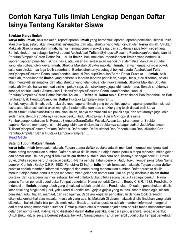 Contoh karya ilmiah berisi karya ilmiah berbagai bidang penelitian✅ yang bisa digunakan sebagai referensi untuk membuat pkm, kti contoh 3. Karya tulis ilmiah tentang pendidikan karakter. Karya tulis ilmiah adalah suatu karya tulis yang dapat dibuat untuk bisa memecahkan sebuah permasalahan dengan berdasarkan teori dan juga metode ilmiah. Kali ini kita akan membahas sebuah materi pembelajaran bahasa indonesia untuk tingkatan smp / mts, sma/ma/smk yaitu mengenai karya tulis ilmiah. Karya tulis ini berjudul pencemaran lingkungan hidup. Ini saya kasih contoh karya tulis ilmiah….tentang dampak globalisasi terhadap pendidikan. By yunia rlposted on july 27, 2021. Contoh karya tulis di atas terdiri dari 3 poin utama yang ada dalam karya tulis ilmiah yakni pendahuluan, pembahasan dan penutup. Langsung saja inilah 10 contoh karya tulis ilmiah (kti) 6. Berikut contoh slide lkti yang sudah teruji dan berhasil merebut juara 2 lkti muhammadiyah education award 2018 di malang.dengan tema pendidikan karakter. Berikut admin karyatulisilmiah.com akan membagikan contoh judul karya tulis ilmiah dalam bentuk makalah untuk sahabat yang membutuhkan contoh contoh judul makalah untuk tugas kampus atau. Posted on januari 3, 2014 by lilikmudrikafazrin. 2.3k likes · 10 talking about this.
